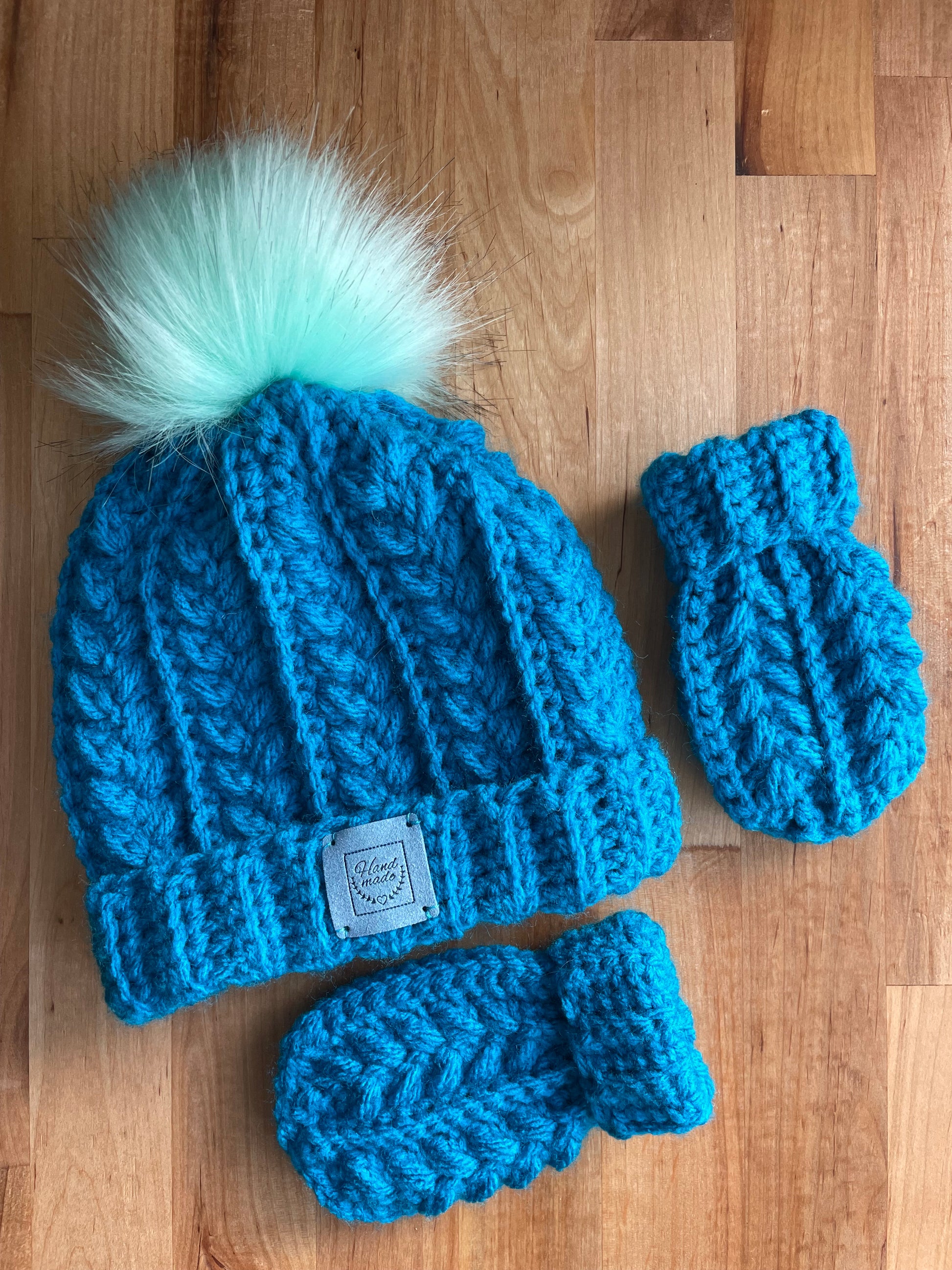 Hand crocheted toque and mitts to keep your littlest one warm this winter. Made in Centreville, Ontario by Lori’s Craft Room.