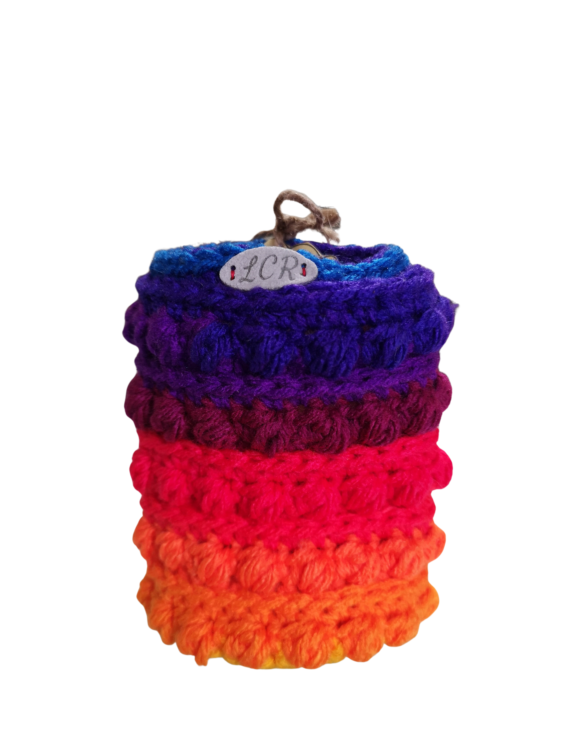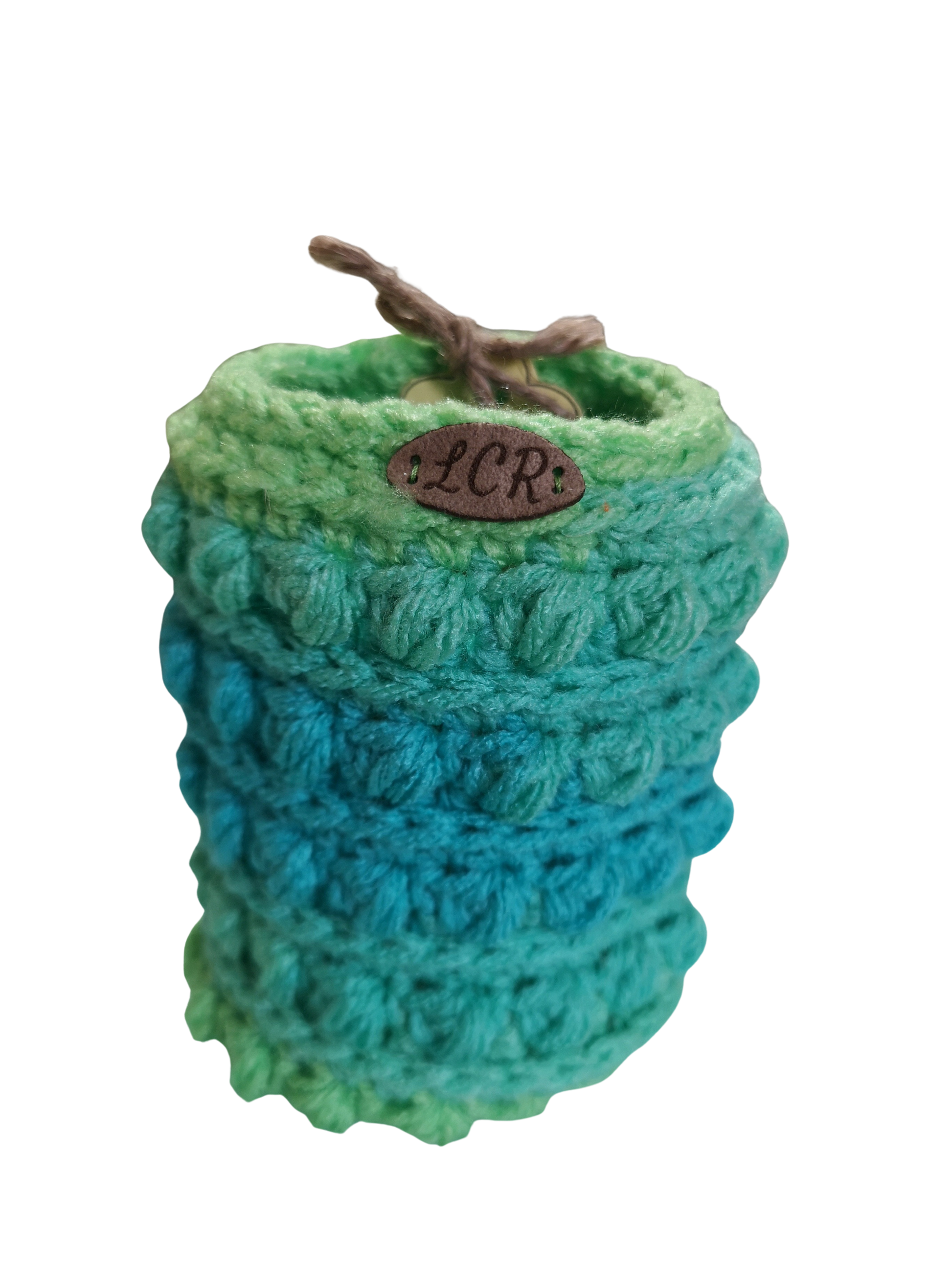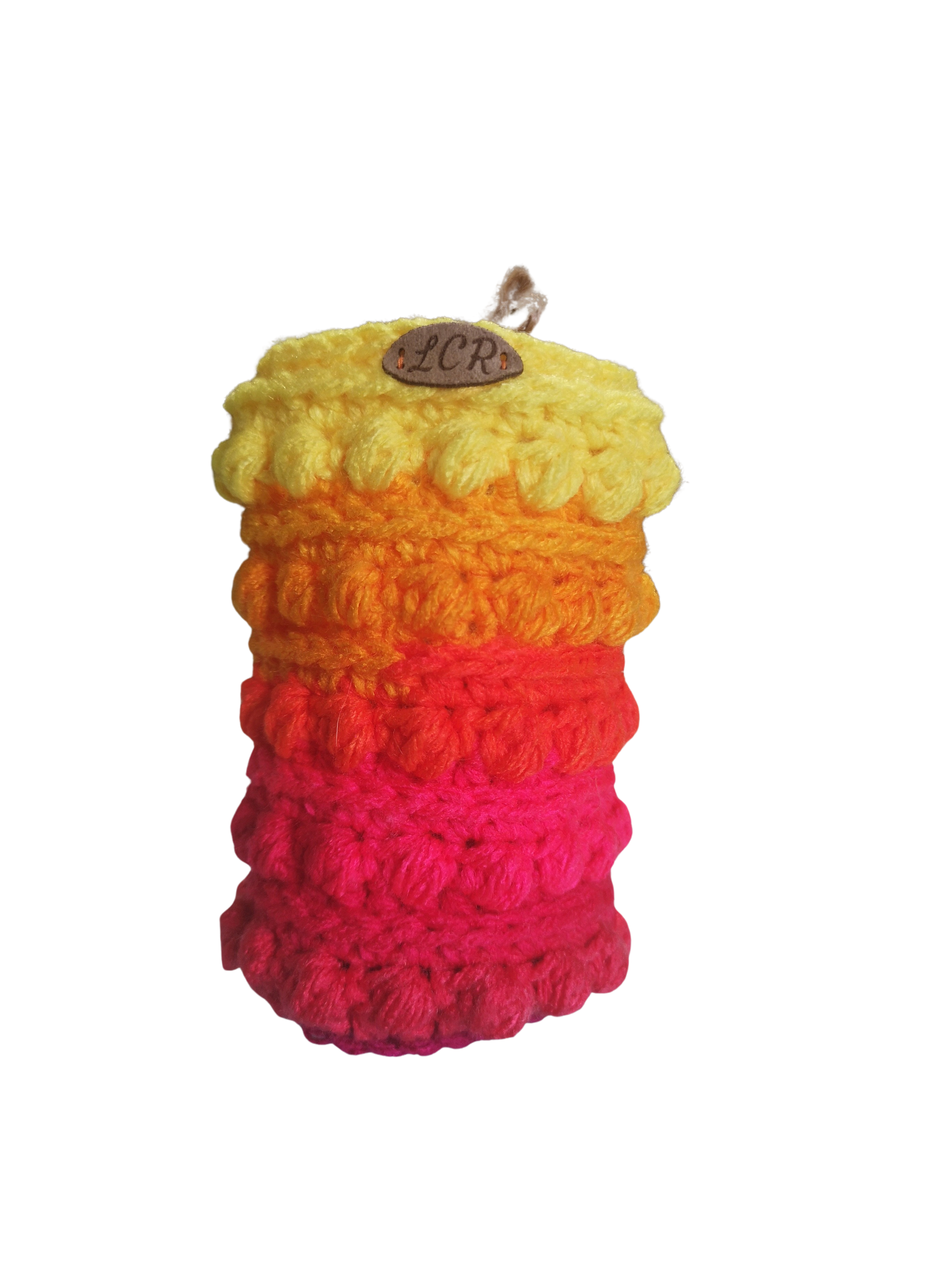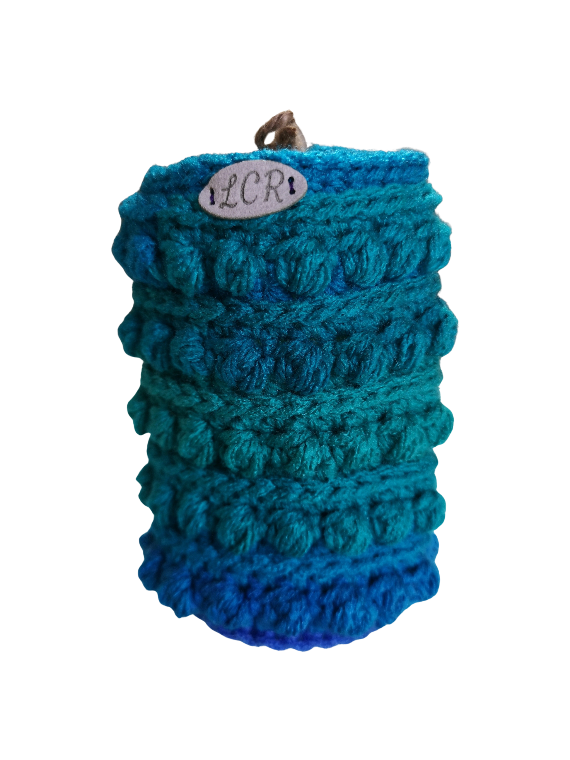 These drink koozies are expertly crocheted by Lori's Craft Room in Centreville, Ontario, using durable acrylic wool for reliable insulation and comfort.