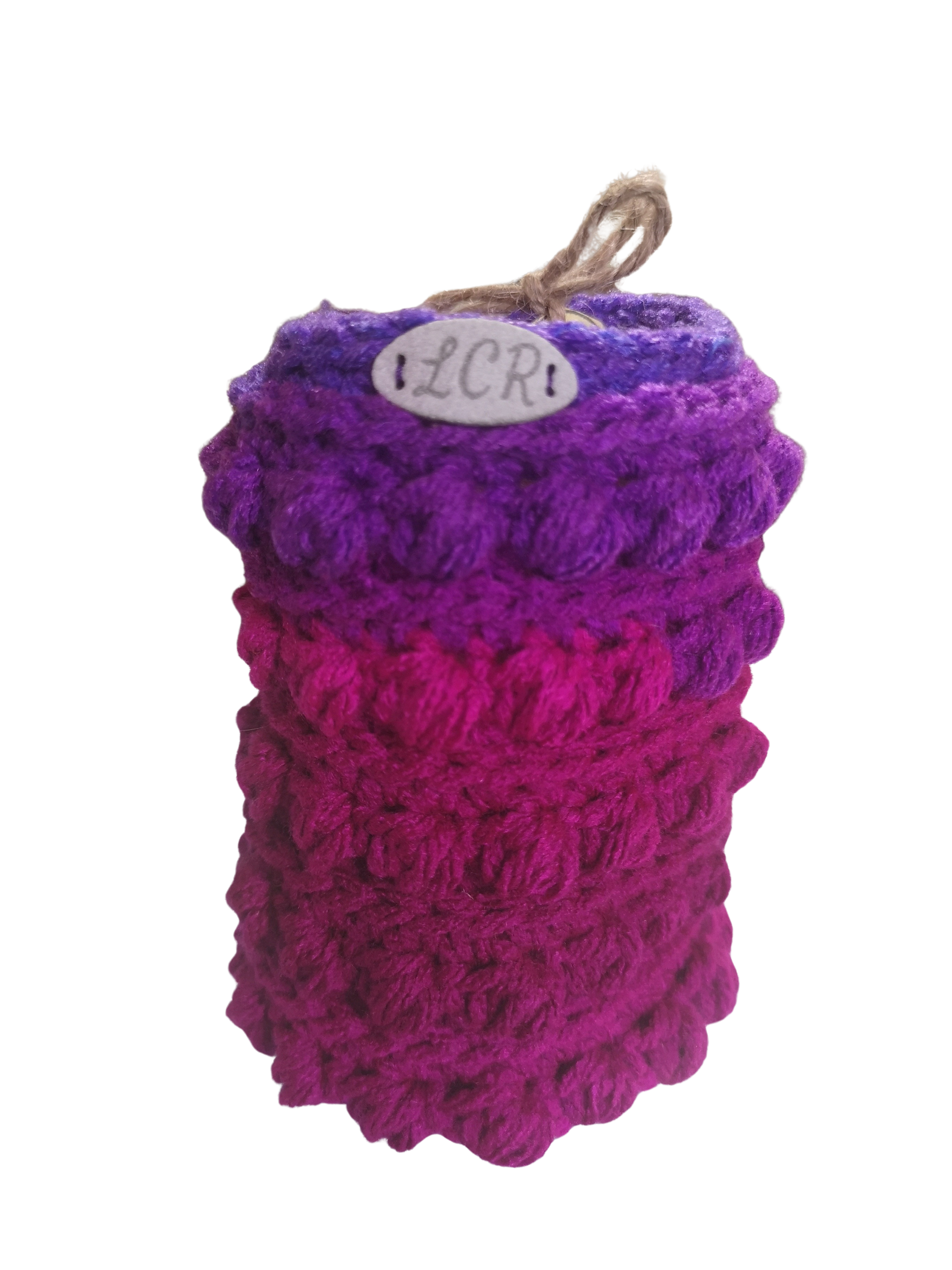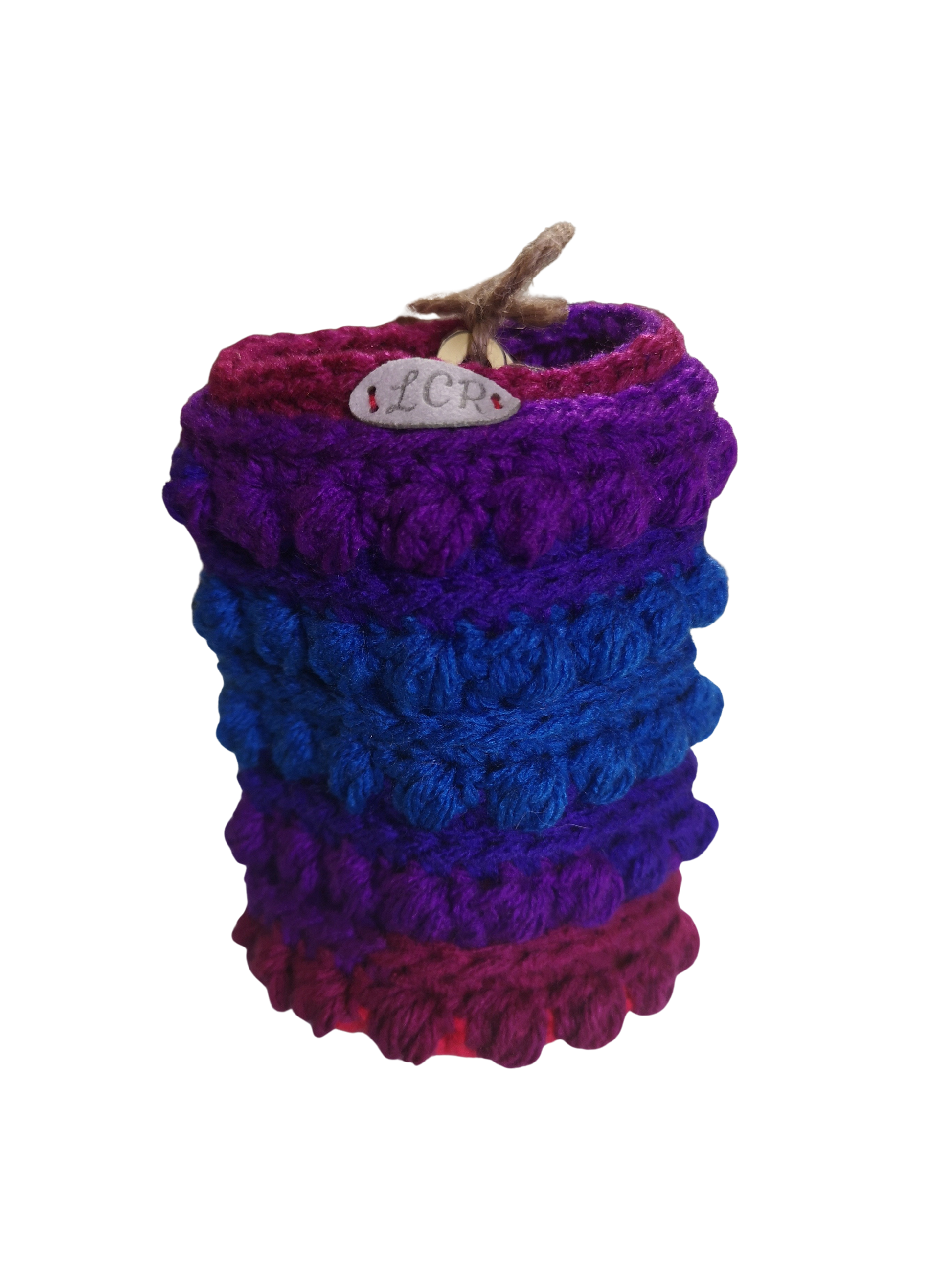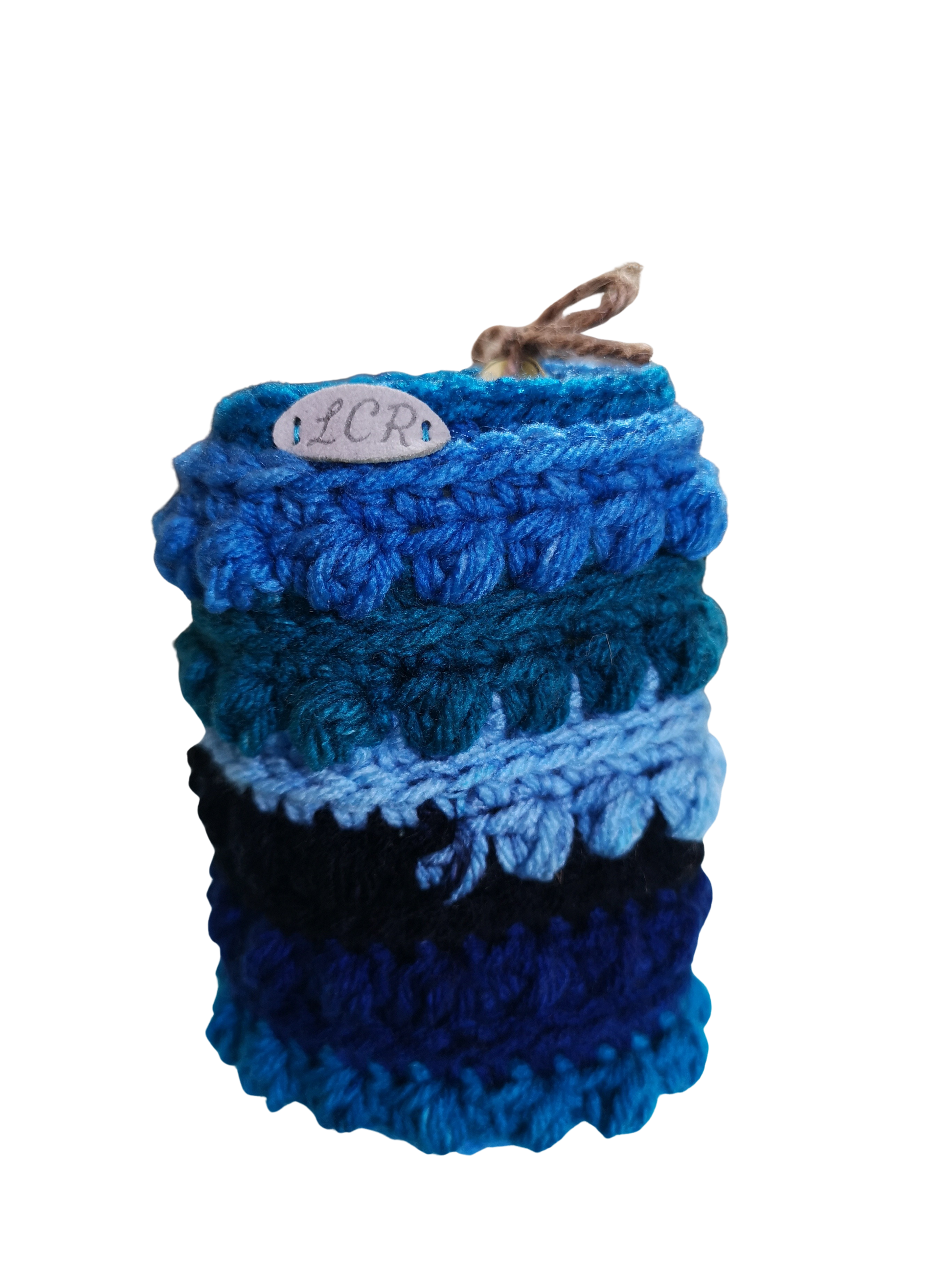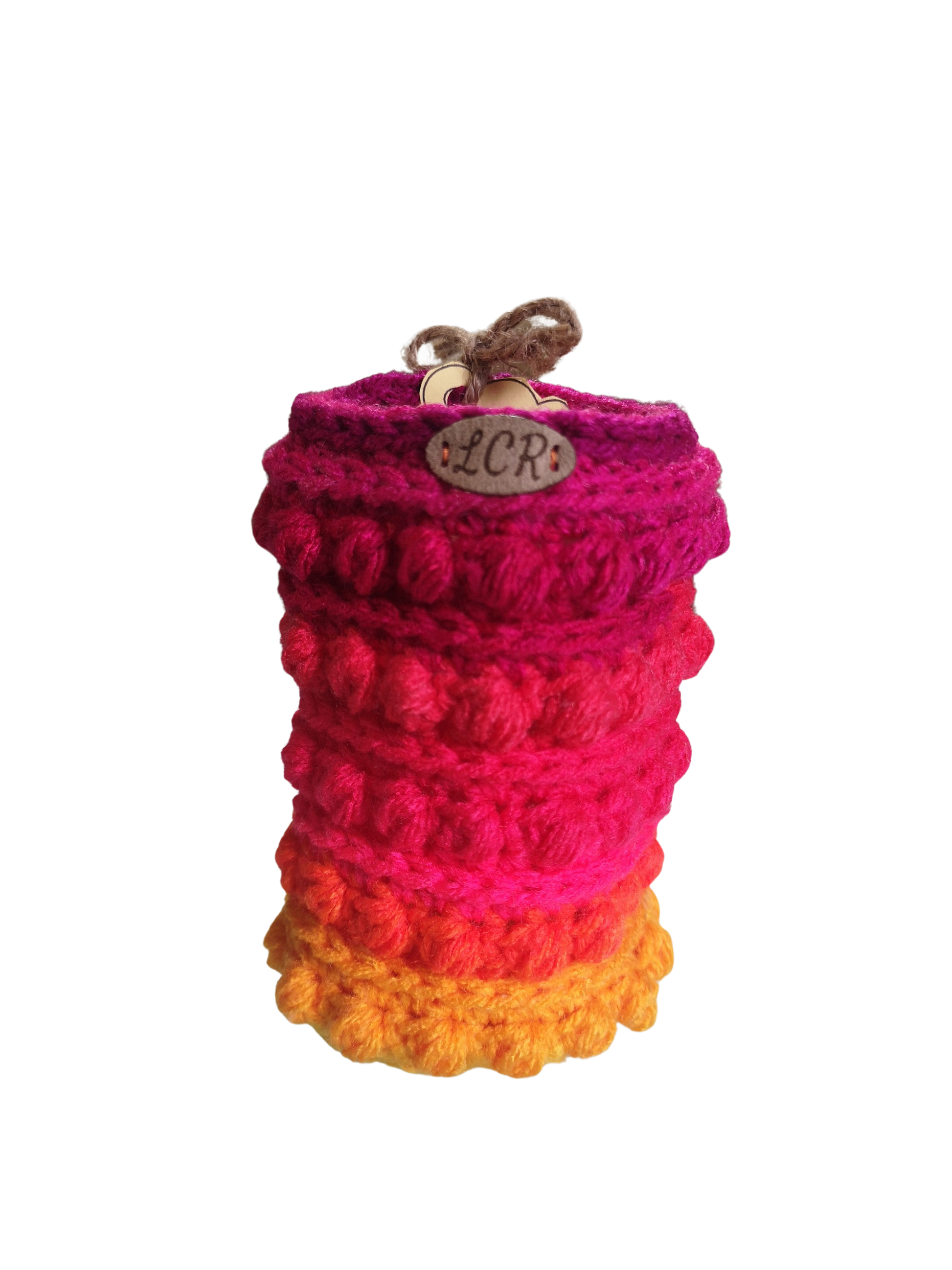 These drink koozies are expertly crocheted by Lori's Craft Room in Centreville, Ontario, using durable acrylic wool for reliable insulation and comfort.