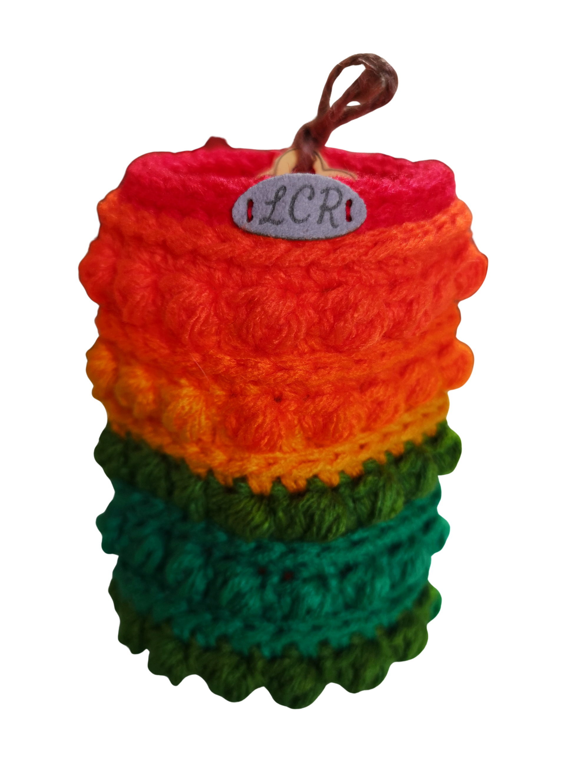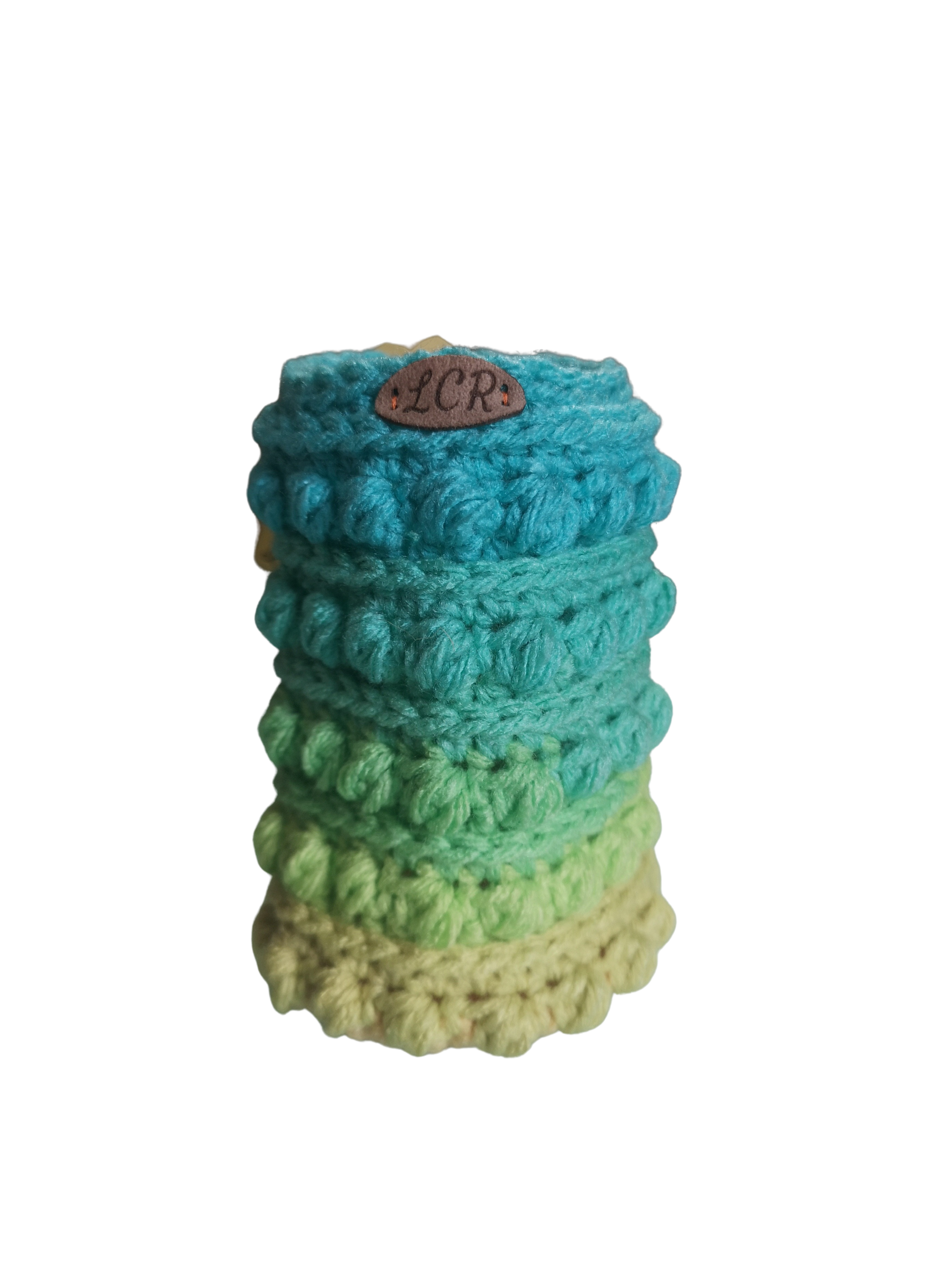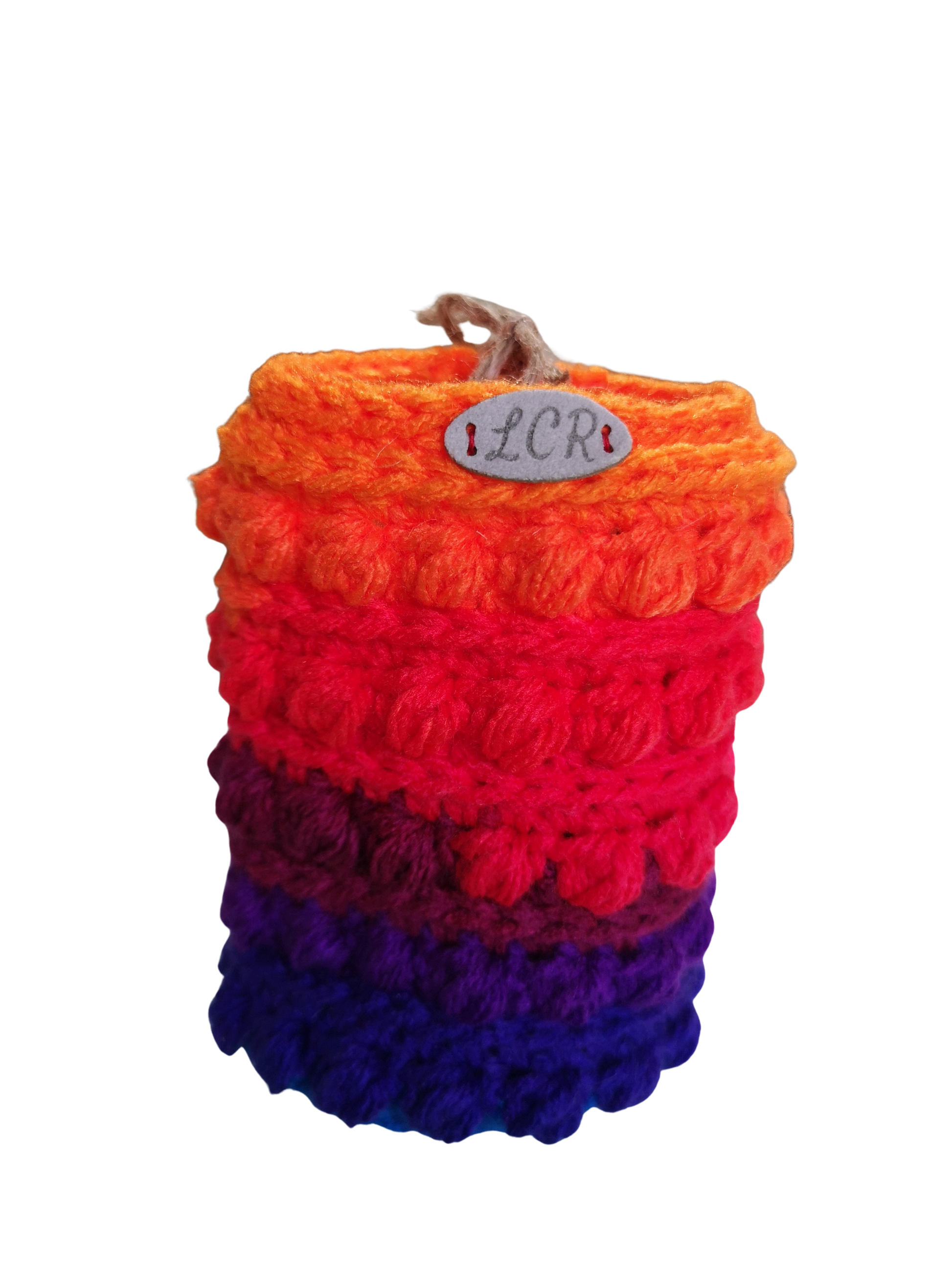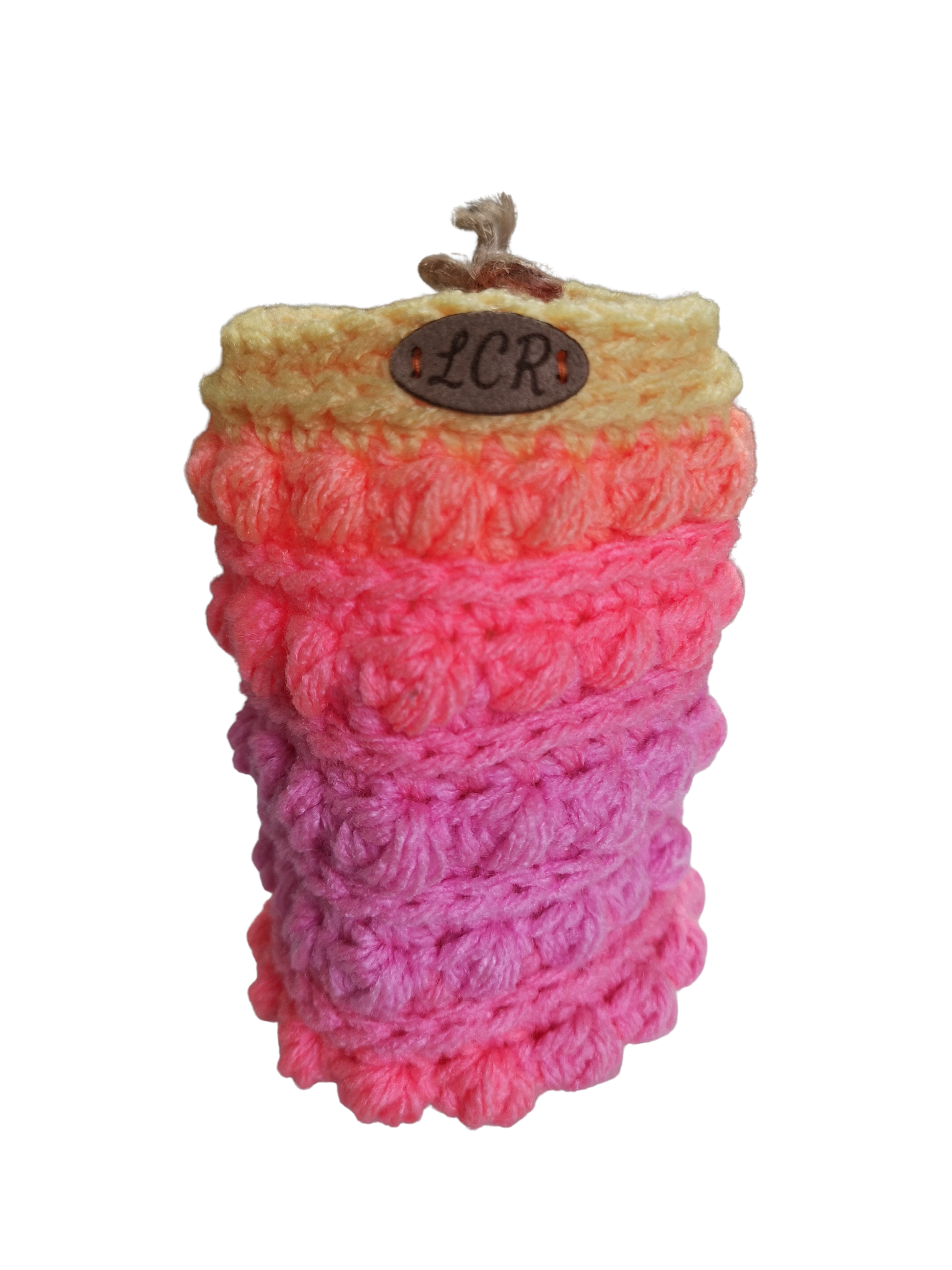 These drink koozies are expertly crocheted by Lori's Craft Room in Centreville, Ontario, using durable acrylic wool for reliable insulation and comfort.