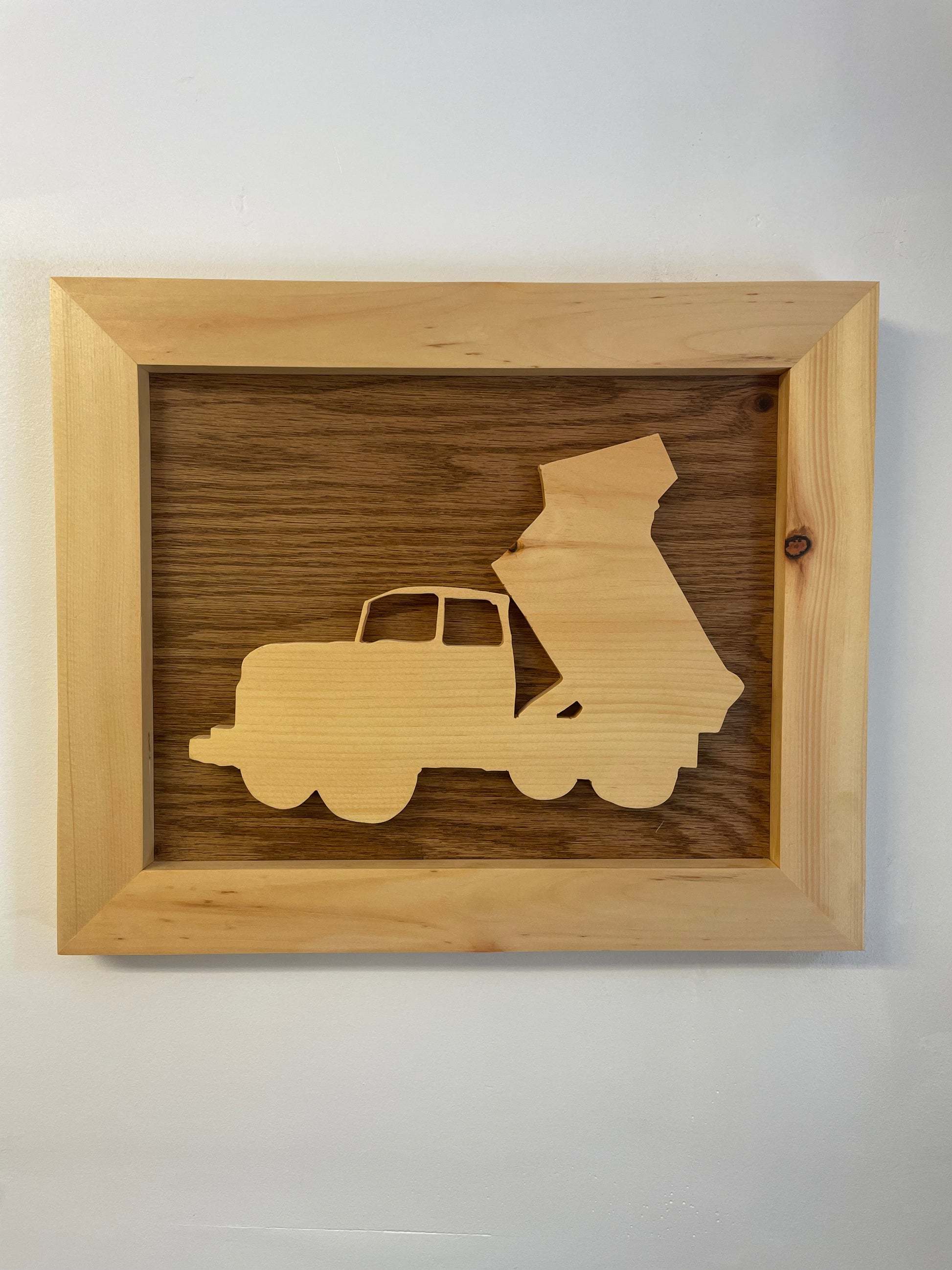Experience the masterful craftsmanship of Z. King Custom Wood Working with our Dump Truck Wooden Wall Art. Measuring 11 1/2" x 14", this stunning piece showcases the intricate artistry and attention to detail that sets it apart. The rustic wooden backdrop adds a touch of natural beauty, while the meticulously handcrafted dump truck illustration brings a sense of whimsy and charm. Hang it proudly on your wall to create a focal point that showcases your appreciation for quality craftsmanship. Perfect for truck enthusiasts or anyone seeking unique and captivating wall decor, our Dump Truck Wooden Wall Art by Z. King Custom Wood Working is a true testament to the beauty of handmade creations.