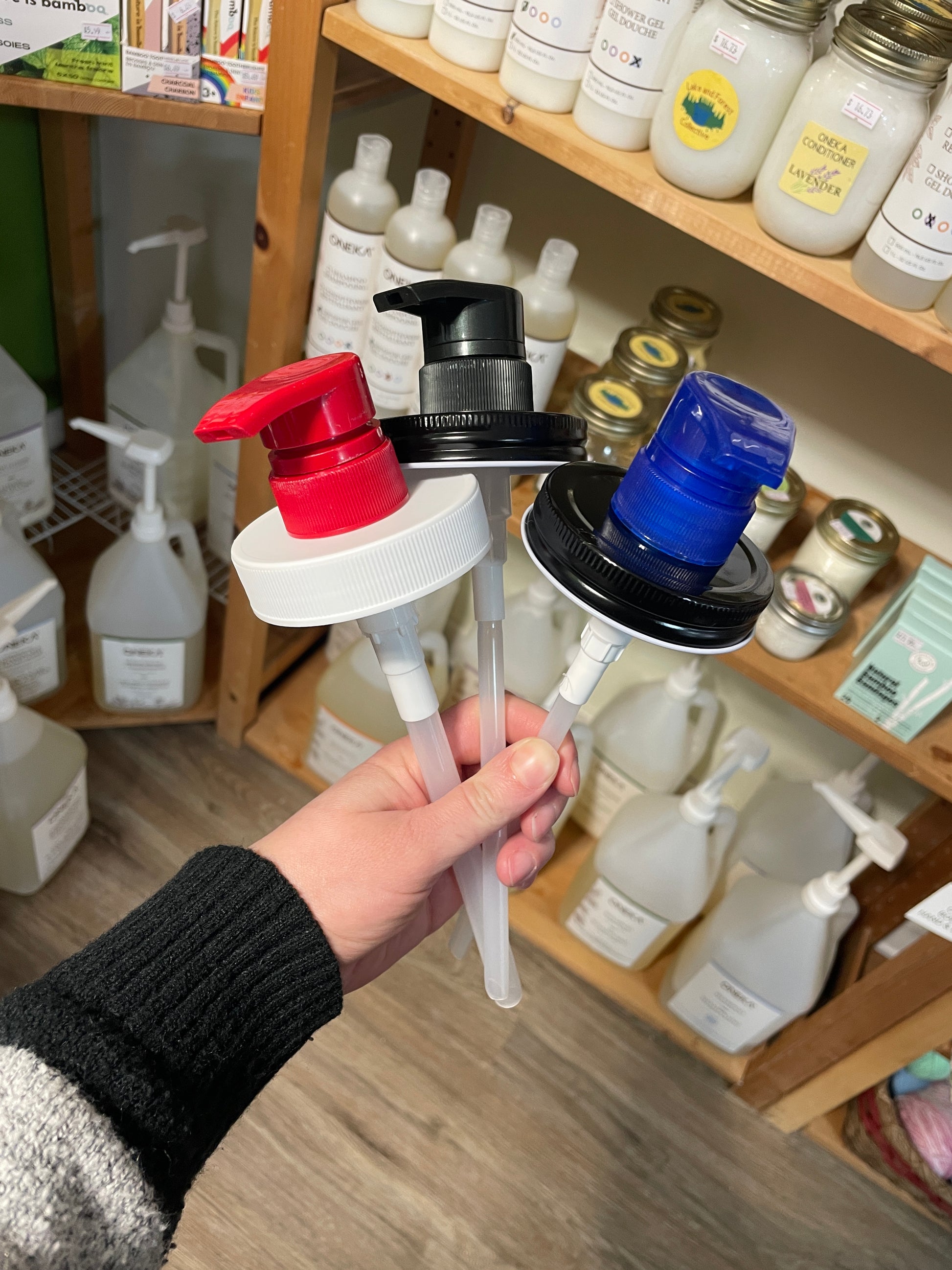 Made from post-consumer salvaged materials, these plastic lids are RUST FREE, have been saved from the waste stream, cleaned, sanitized, and repurposed with care by loving and creative humans. These lids fit all regular mouth mason jars and have pumps with dip tubes that will fit 1L mason jars or 500mL mason jars.