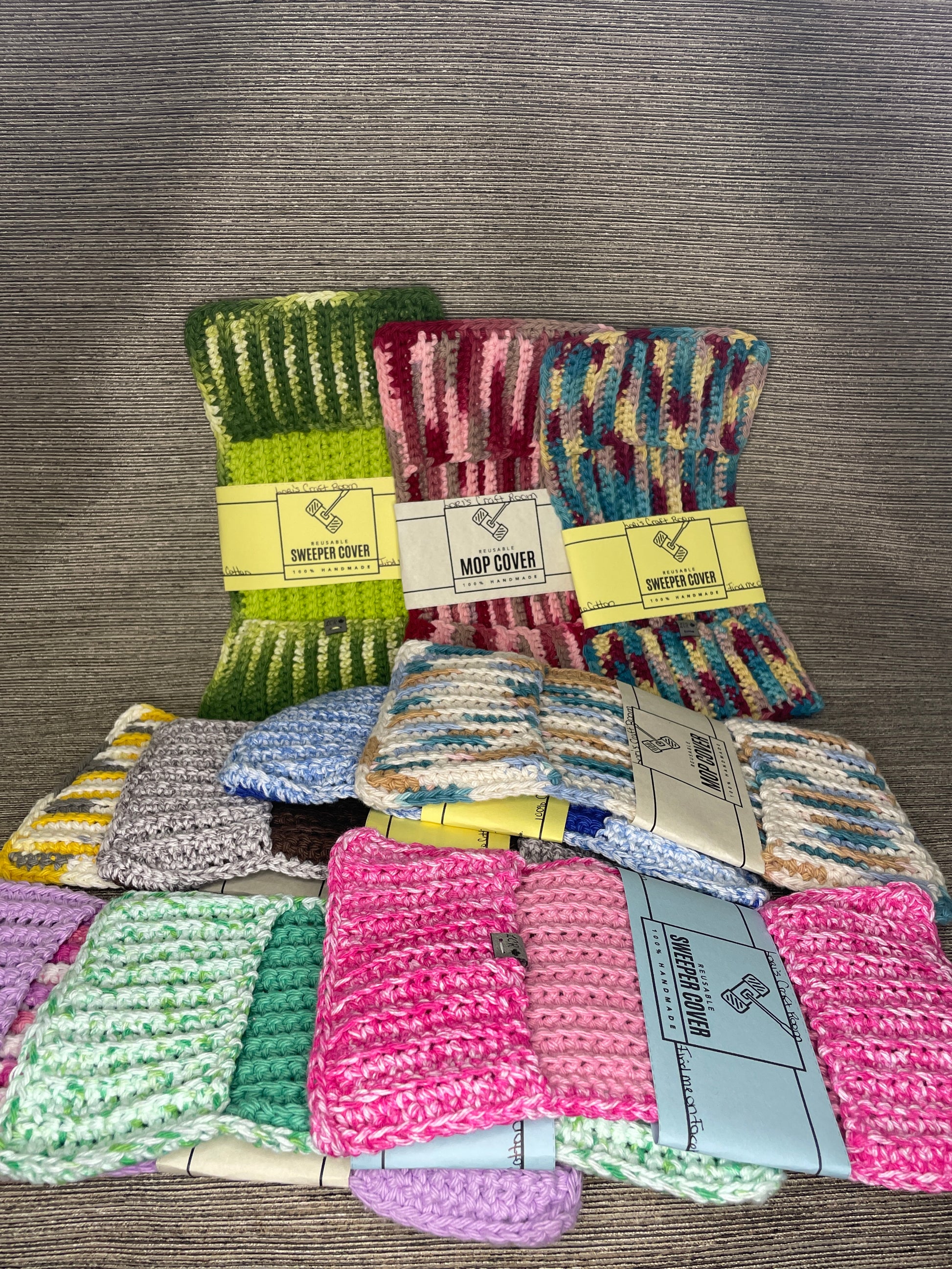 Effortlessly clean your floors with these Reusable Sweeper Mop Covers. Simply throw them in the laundry to keep them fresh and clean. Handmade in Centreville, Ontario by Lori's Craft room, these crocheted covers are not only reusable but also add a touch of charm to your cleaning routine. Say goodbye to disposable wipes and hello to our environmentally-friendly option.