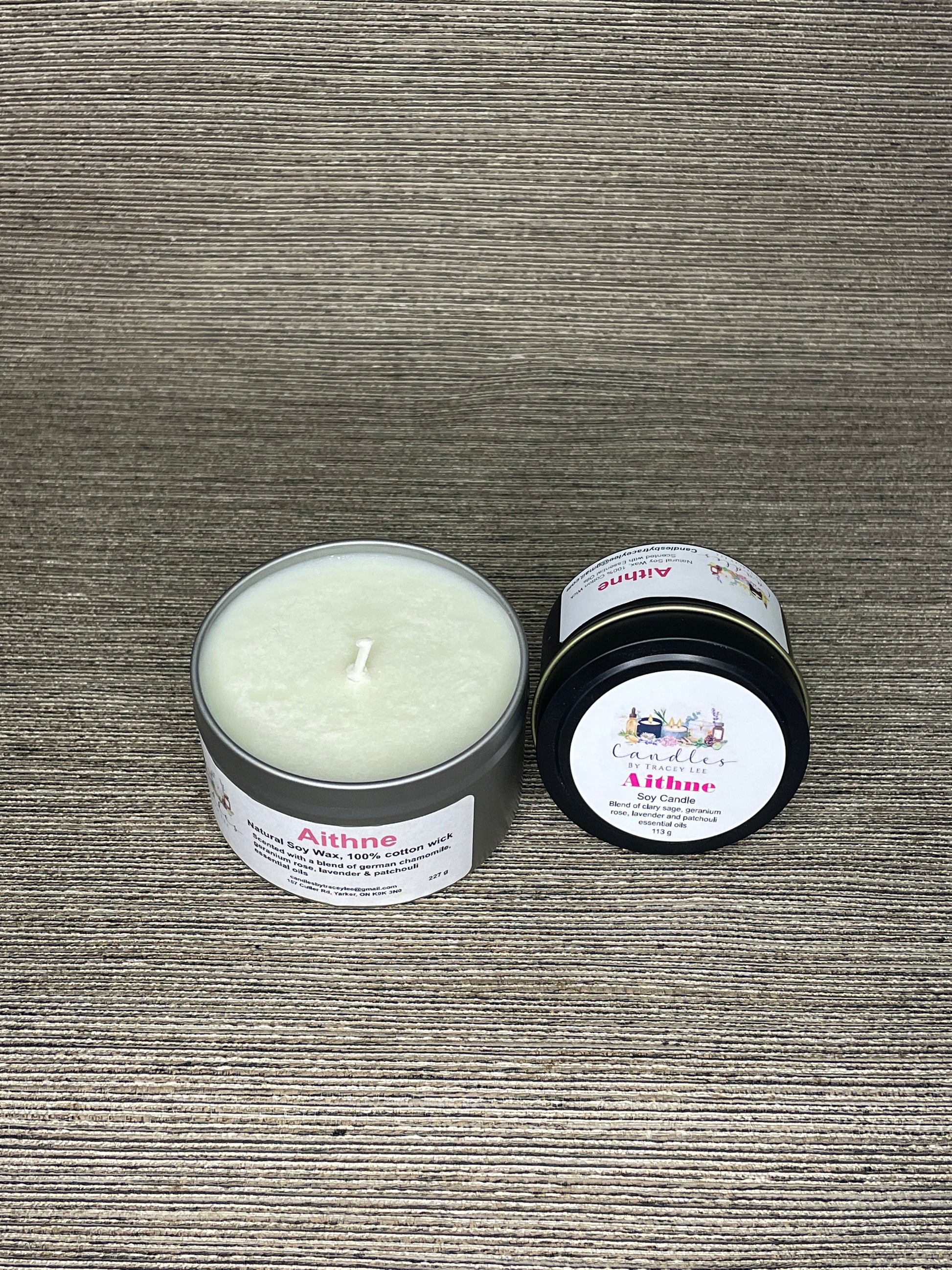 Experience the soothing scents of German camomile, geranium rose, lavender, and patchouli essential oils with Aithne, a hand-poured soy wax candle by Soap by Tracey Lee. Made in small batches in Yarker, Ontario and featuring a 100% cotton wick, this natural candle is available in 227g or 113g sizes for long-lasting relaxation.